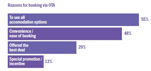 当被问及这一偏好背后的原因时,55%的受访者表示是为了在一个平台查看所有的住宿选择,而48%的受访者明确表示使用在线旅行社更为便利。