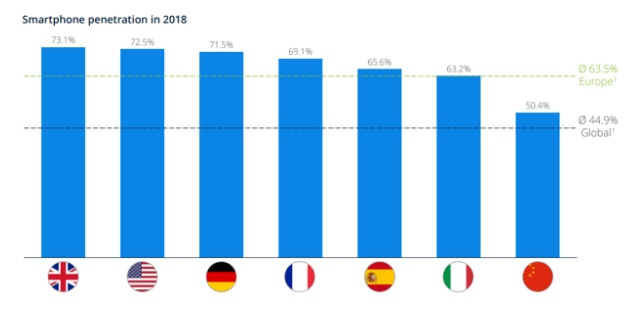 全球智能手机平均普及率为44.9%,仍有巨大的增长空间。新兴国家收入水平的提高将带动智能手机普及率,为在线旅行社提供一个巨大的目标市场。