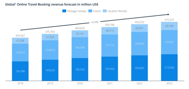 行业的预期增长将为拥有在线旅行预订业务的公司带来更高的收入。预计全球在线旅游预订收入到2023年的复合年增长率将达到6.4%。