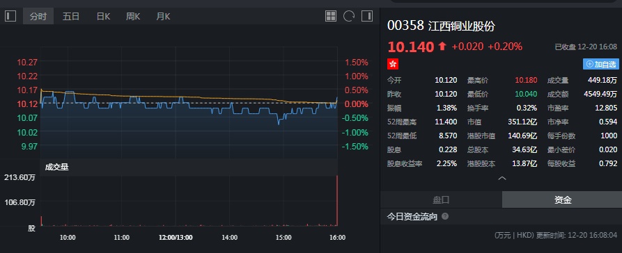 截至今日收盘,江西铜业涨0.2%,报10.14港元。