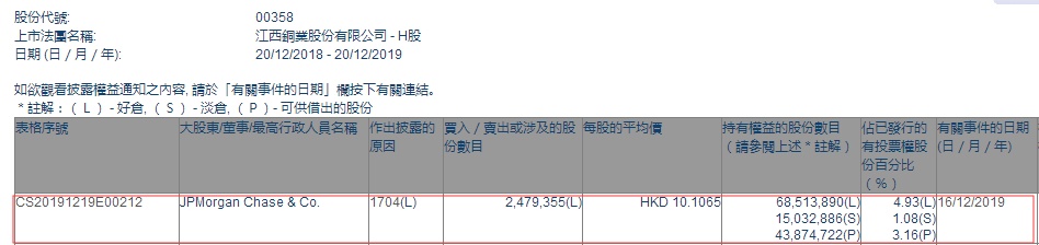 智通财经APP获悉,联交所最新资料显示,12月16日,摩根大通减持江西铜业约(00358)247.94万股,每股作价10.1065港元,总金额约为2505.8万港元。减持后最新持股数目约为6851.39万股,最新持股比例为4.93%。