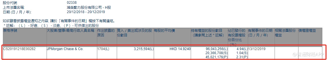 智通财经APP获悉,联交所最新资料显示,12月13日,摩根大通减持潍柴动力(02338)321.56万股,每股作价14.9240港元,总金额约为4843.73万港元。增持后最新持股数目约为9604.33万股,最新持股比例为4.94%。