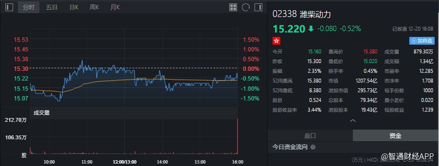 截至今日收盘,潍柴动力跌0.52%,报15.22港元。