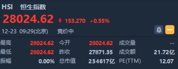智通财经APP获悉,恒生指数开盘涨153.27点或0.55%,报28024.62点。国企指数涨0.31%,报11064.86点。红筹指数涨0.24%,报4454.36点。大市盘前成交21.72亿港元。