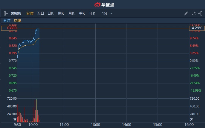 智通财经APP获悉,通达集团(00698)近期股价持续攀升,今日盘中股价续涨近15%,本月累计涨幅超五成。截至发稿,涨14.29%,报0.88港元,成交额6778.24万港元。