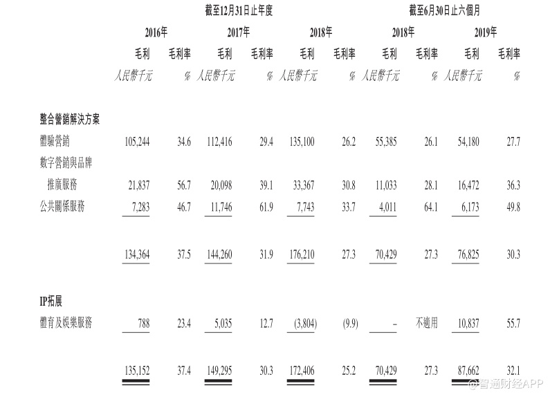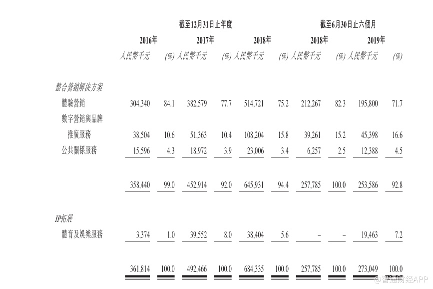 但是数字营销与品牌推广服务的稳步崛起并不能抵消体验营销服务下滑带来的影响。2019年上半年,体验营销服务实现营业收入1.95亿元,同比下降7.76%。受此影响,整合营销方案营业收入为2.53亿元,同比下降1.63%。而过去三年,该业务整体一直保持着稳健的增长,年复合增长率为34%。