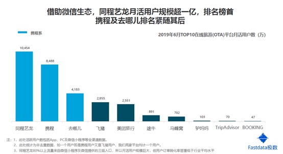 在不久前的“2019年全球小程序生态大会”上,同程艺龙的小程序“同程艺龙酒店机票火车票门票”获得了第三届阿拉丁神灯奖“年度最佳小程序”奖项。除了较高的运营效率外,庞大的用户规模也是同程艺龙连续获奖的根本原因。财报显示,同程艺龙2019年三季度的MAU达到2.34亿人,同比增长13.4%,其中,来自微信支付及小程序下拉列表的MAU为1.25亿人。而根据CNNIC发布的第44次互联网络调查报告,截至2019年6月的全国网民规模同比仅增长了1.6%。凭借来自小程序的流量红利,同程艺龙已经成为中国在线旅游行业MAU最大的平台。根据第三方机构Fastdata发布的《2019年上半年中国在线旅游行业分析报告》,同程艺龙的月活跃用户规模位居行业第一。