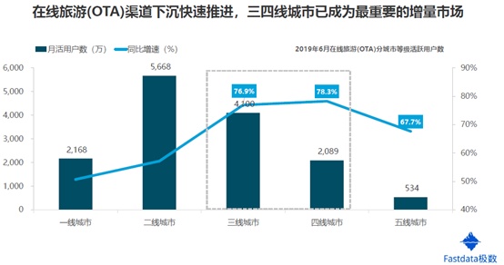 非一线城市还有另外一种说法,即“下沉市场”,也被认为是一个巨大的流量风口。根据《2019年上半年中国在线旅游行业分析报告》,来自三线及四线城市的OTA月活增速分别为76.9%和78.3%,已经成为最重要的增量市场。