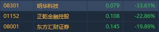 智通财经APP获悉,正乾金融控股(01152)、东方汇财证券(08001)及明华科技(08301)遭联交所通知暂停买卖股份,今日盘中股价均遭重挫。截至11时14分,明华科技跌33.61%,报价0.079港元,正乾金融控股跌22.86%,报0.108港元,东方汇财证券跌19.89%,报0.145港元。