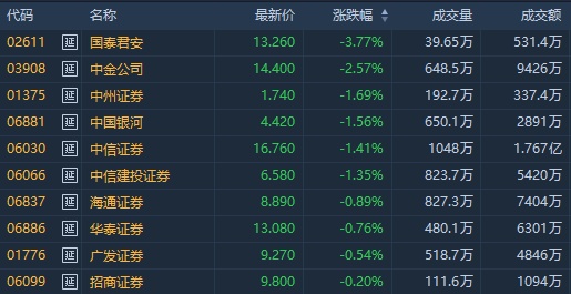 截至发稿,国泰君安(02611)跌3.92%,报13.24港元;中金公司(03908)跌2.84%,报14.36港元;中信证券(06030)跌1.88%,报16.68港元;中信建投证券(06066)跌1.35%,报6.58港元。
