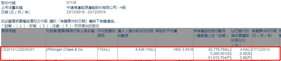 智通财经APP获悉,联交所最新资料显示,12月17日,摩根大通减持中远海能(01138)443.911万股,每股作价3.5418港元,总金额约为1572.24万港元。增持后最新持股数目约为6277.88万股,最新持股比例为4.84%。
