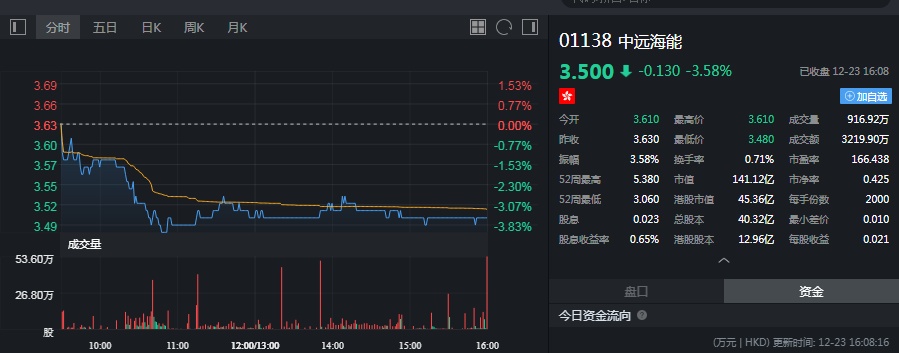 截至今日收盘,中远海能(01138)跌3.58%,报3.50港元。