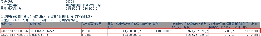智通财经APP获悉,联交所最新资料显示,12月18日,GIC增持中国电信(00728)1420万股,每股作价3.0881港元,总金额约为4385.1万港元。增持后最新持股数目约为9.71亿股,最新持股比例为7%。