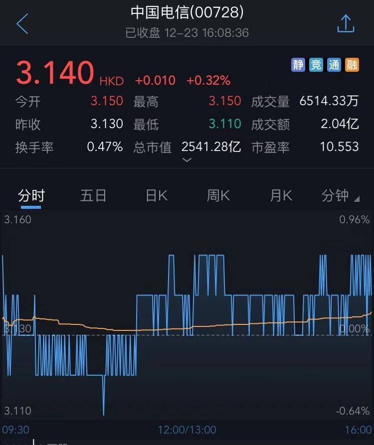 截至今日收盘,中国电信涨0.32%,报3.14港元。