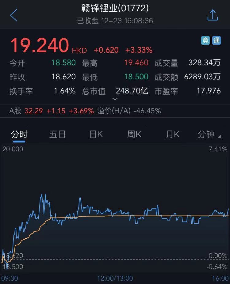 截至今日收盘,赣锋锂业涨3.33%,报19.24港元。