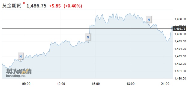 黄金期货报1486.75美元/盎司,涨0.4%。