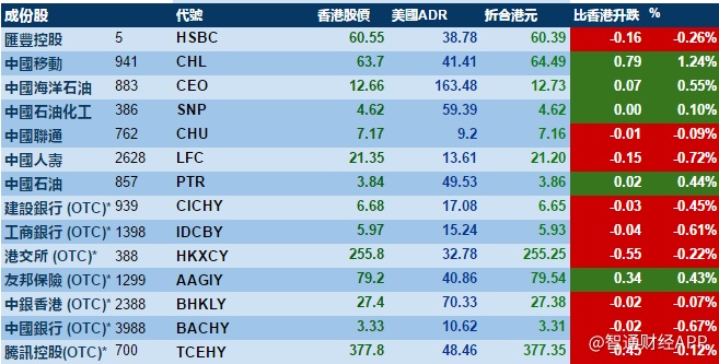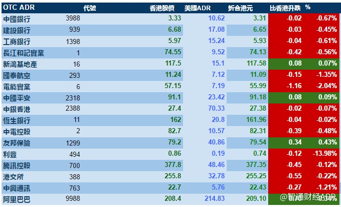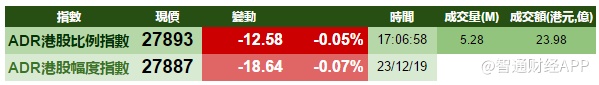 智通财经APP获悉,12月24日,美股续创新高,但港股ADR指数全日未有跟随升势,按比例计算,收报27893点,跌12.58点。