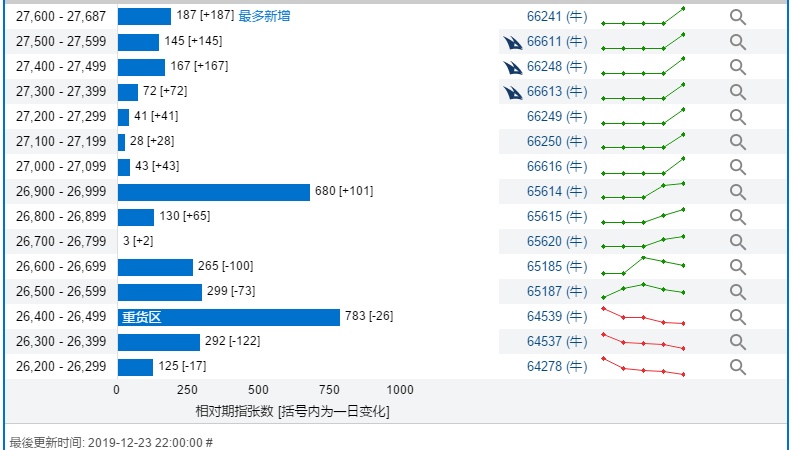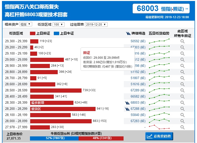 智通财经APP获悉,截至12月23日,恒指最新的牛熊街货比例52:48。瑞信恒指牛熊证街货分布图中的数据显示,熊证街货重货区在28200-28299区间,该区间最新熊证数量为941张,较上一交易日减少16张,最多新增在28300-28399区间,较上一交易日增加49张。牛证街货重货区在26400-26499区间,该区间最新牛证数量为783张,较上一交易日减少26张,最多新增在27600-27687区间,较上一交易日增加187张。