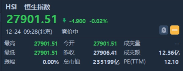 智通财经APP获悉,恒生指数开盘微跌0.02%,报27901.51点。国企指数跌0.14%,报11036.96点。红筹指数涨0.01%,报4451.61点。大市盘前成交12.37亿港元。