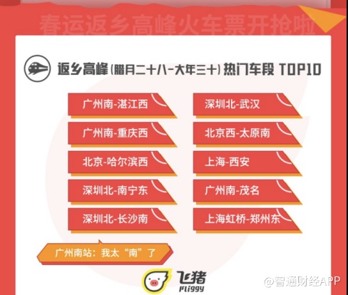 广州南站春运高峰客流量最高,成为最繁忙的火车站,占据了TOP10中的三个车段:广州南-湛江西,广州南-重庆西,广州南-茂名。