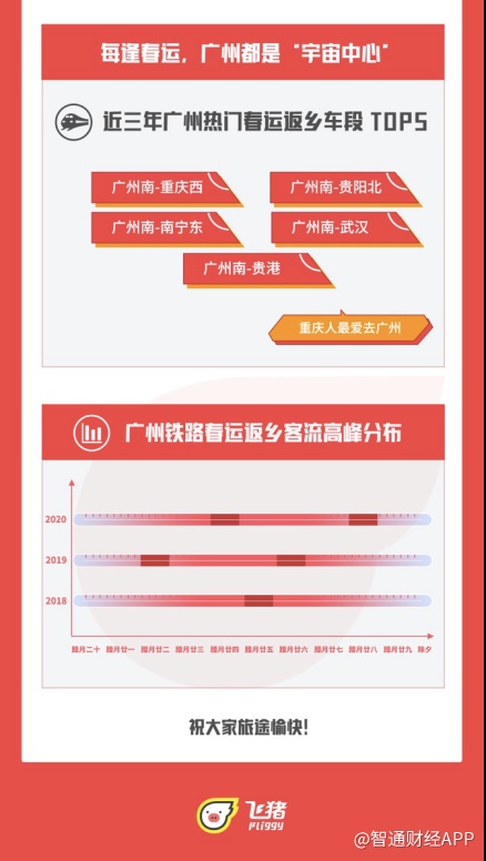 智通财经APP获悉,12月24日,农历腊月二十八(1月22日)的火车票开售,返乡高峰的“抢票大战”迎来关键时刻。由于工作繁忙、请假不便等因素,大部分上班族会在过年前几天踏上返乡旅程。飞猪火车票购票及预约数据显示,返乡高峰的TOP10热门车段,始发站被北京、上海、广州、深圳四城占据。返乡高峰期间,广州南站和白云机场的购票量均为最高,广州将成为2020年春运大枢纽,而从广州出发返乡数量最多的,是饮食差异最大的重庆人。