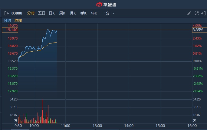 智通财经APP获悉,金山软件(03888)发布公告,拟分拆金山云于美国上市。拆分利好持续发酵,金山软件昨日盘中一度涨近4%,今日续涨3%。截至发稿,涨3.24%,报19.12港元,成交额1.35亿港元。