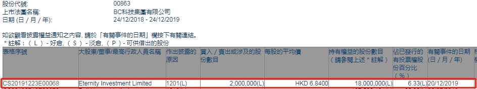 智通财经APP获悉,联交所最新资料显示,12月20日,Eternity Investment减持BC科技集团(00863)200万股,每股作价6.84港元,总金额约为1368万港元。减持后最新持股数目约为1800万股,最新持股比例为6.33%。