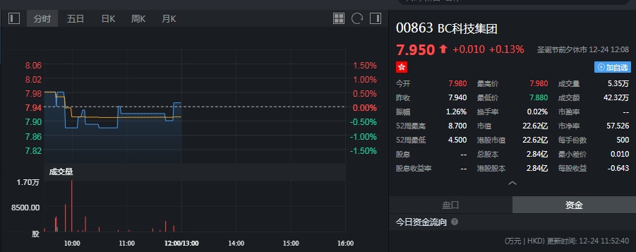 截至今日收盘,BC科技集团涨0.13%,报7.95港元。