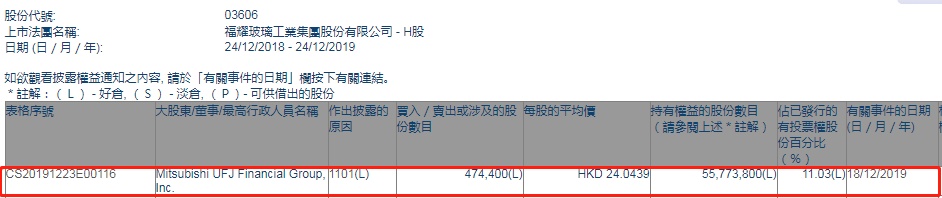智通财经APP获悉,联交所最新资料显示,12月18日,三菱日联金融增持福耀玻璃(03606)47.44万股,每股作价24.0439港元,总金额约为1140.64万港元。增持后最新持股数目约为5577.38万股,最新持股比例为11.03%。
