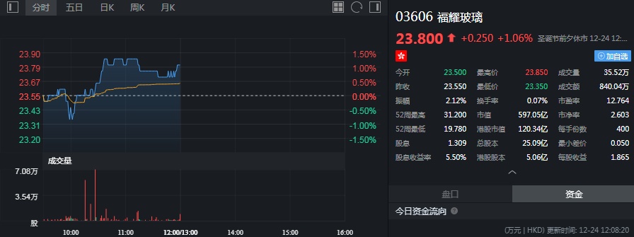 截至今日收盘,福耀玻璃涨1.06%,报23.80港元。