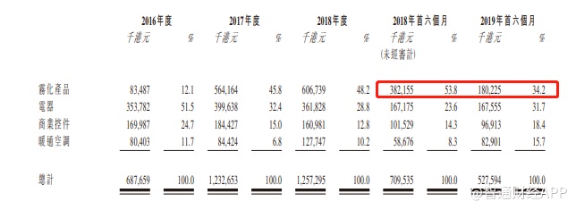 按产品分类来看,该公司能够制造交付的产品包括PCBA、多功能模块及电子制成品,涵盖包括雾化产品、电器、商业控件及暖通空调在内的产品应用。可以看到, 2016-2018年雾化产品逐渐成为公司的主要收入来源。2018年6月份,雾化产品收入占比一度达到53.8%,这主要是由于公司的向公司两名大客户销售雾化产品,由于2019年终止了与其中一名客户的业务关系,雾化收入直接腰斩。