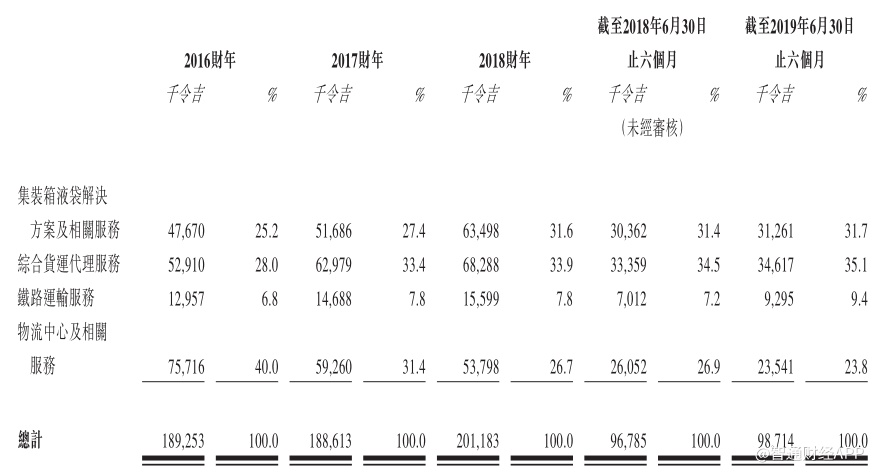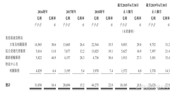 除此之外,综合货运代理服务于近几年逐渐成为公司收入贡献比重最达的业务。其中,主要包括无船承运人服务、货运代理服务两项服务。截至2019年6月30日,综合货运代理服务收入占比达35.1%。