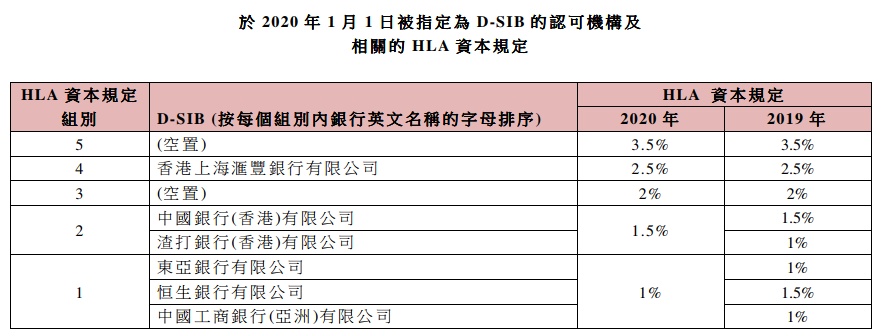与2018年12月公布的D-SIB名单相比,在此次公布的名单中,其中一间认可机构(渣打银行(香港)有限公司)的HLA资本规定由1%上调至1.5%,另一间认可机构(恒生银行有限公司)的HLA资本规定由1.5%下调至1%。