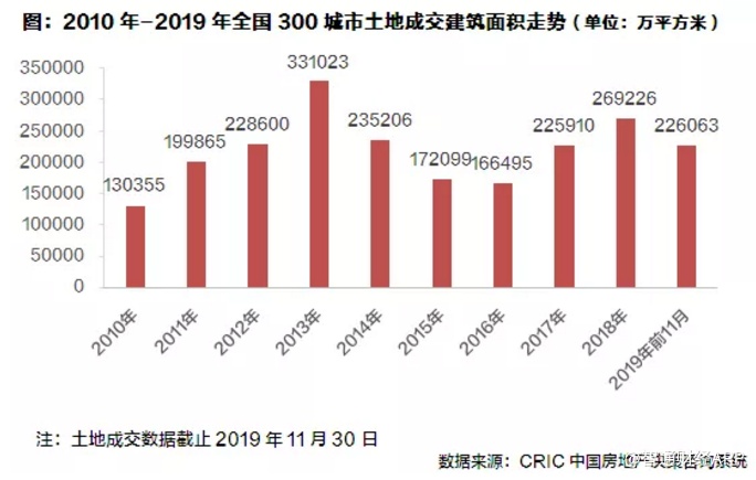土地市场方面,今年前11个月,全国300个城市共推出各类用地20.7亿平方米,同比由2018年同期的增长24.3%转为下降1.4%。下半年,随着融资收紧,全国土地市场流拍水平上升,但仍低于2018年下半年的流拍水平。截止2019年11月底,全国300城土地市场成交建筑面积23亿平方米,较2018年同期下降了3.7%。