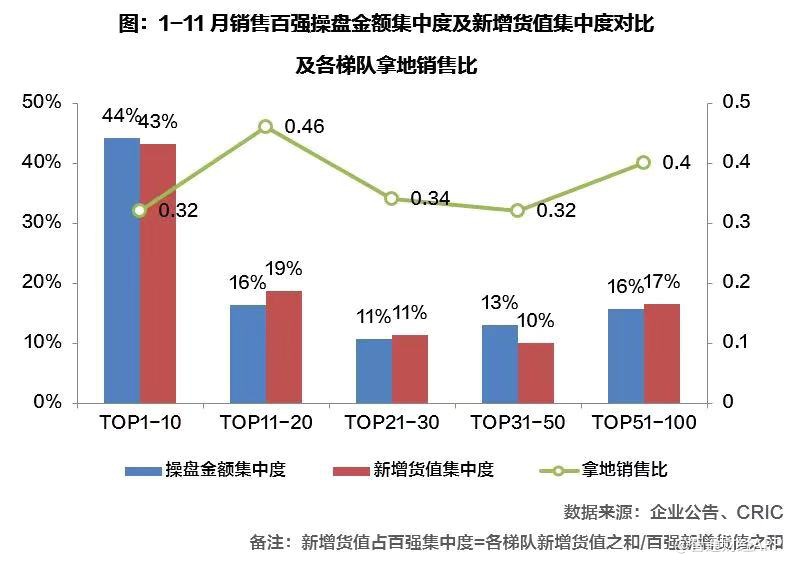 从绝对值看,土地资源仍进一步向头部房企集中,TOP50房企占据了百强新增货值的83%。
