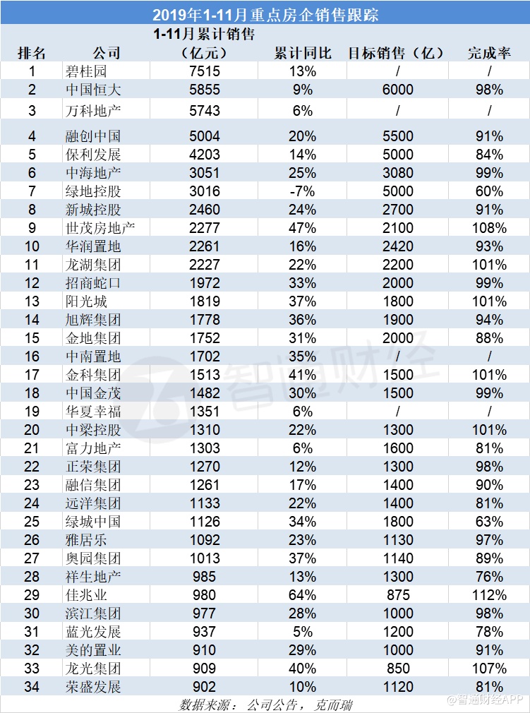 百强房企中,部分公司已经在11月超额完成全年目标,比如世茂房地产、龙湖集团、阳光城、佳兆业等。绿地控股、绿城中国、蓝光发展、嘉禾集团等房企销售目标完成率不足80%,12月销售压力较大。今年前11个月,绿地控股、泰禾集团、佳源集团这三家TOP50房企合约销售额出现负增长。