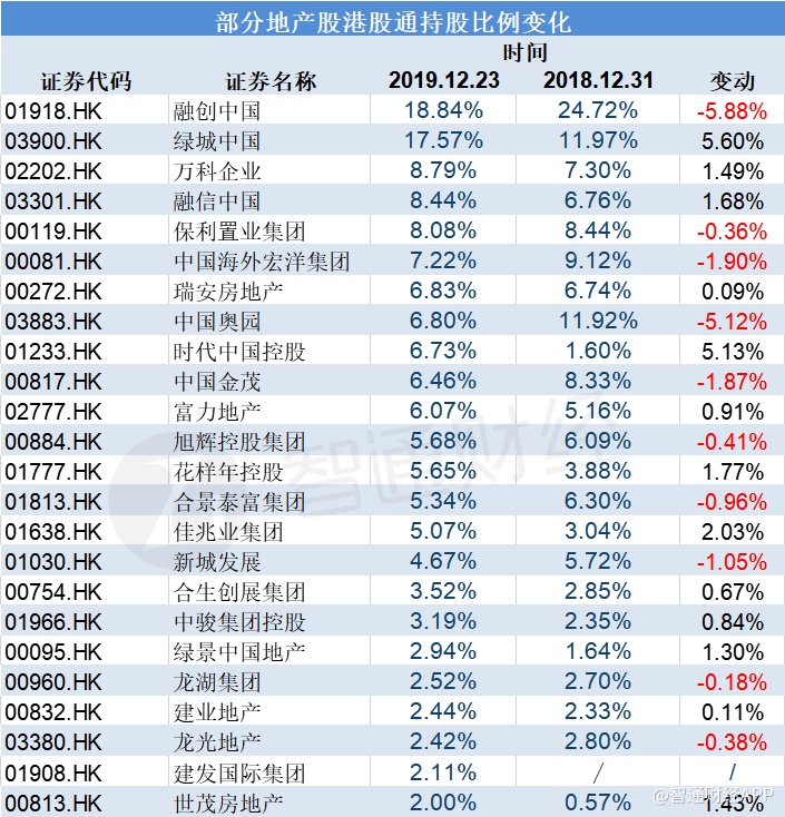 智通财经APP统计,今年新纳入港股通的地产股有4只,除了上文提及的中梁控股之外,还包括建发国际集团(01908)、弘阳地产(01996)、美的置业(03990)。截至目前港股通名单里共有34只地产股,其中港通资金持股比例最高的融创中国。相比年初,南下资金对绿城中国(03900)、时代中国控股、佳兆业集团(01638)、花样年控股(01777)等内房股的持股比例显著增加。