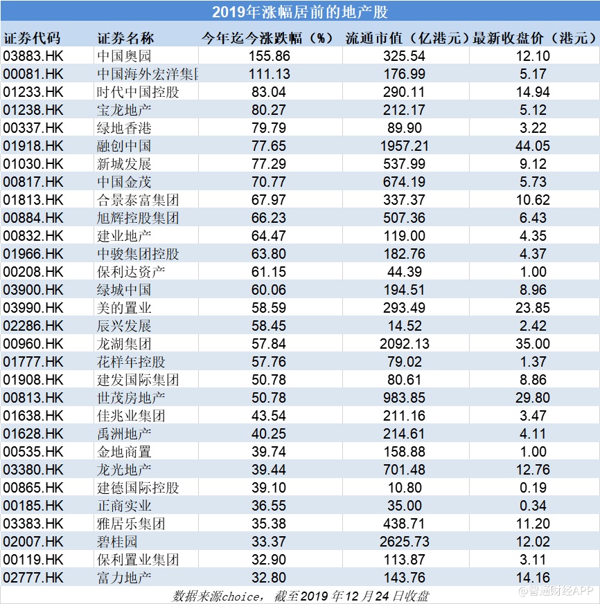 今年表现最亮眼的地产股要数中国奥园(03883),累计涨幅为155.86%,此外,中国海外宏洋集团(00081)、时代中国控股(01233)、宝龙地产、融创中国等均录得70%以上涨幅。从数据可以发现,今年表现抢眼的地产股大多为中等规模房企,这些房企销售持续增长,增速领先。