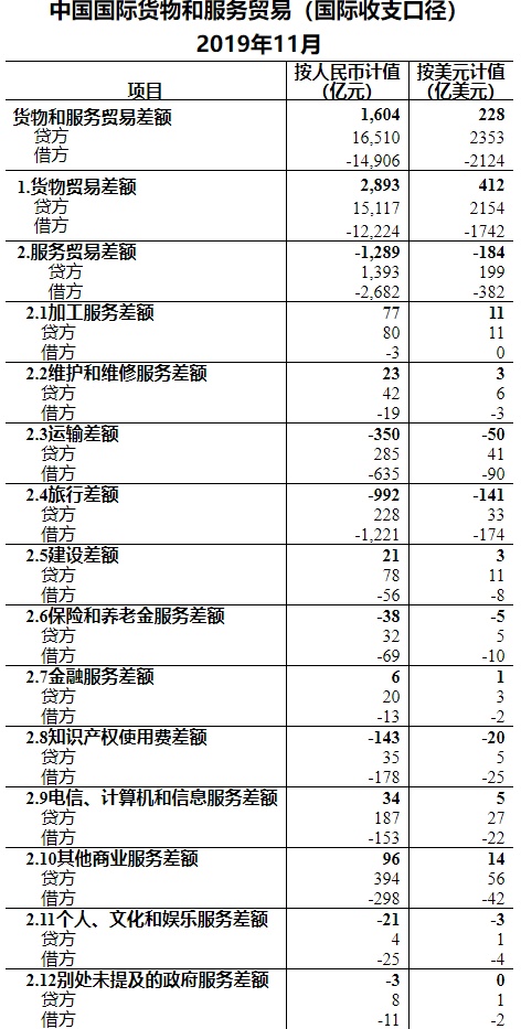 按美元计值,2019年11月,我国国际收支口径的国际货物和服务贸易收入2353亿美元,支出2124亿美元,顺差228亿美元。其中,货物贸易收入2154亿美元,支出1742亿美元,顺差412亿美元;服务贸易收入199亿美元,支出382亿美元,逆差184亿美元。