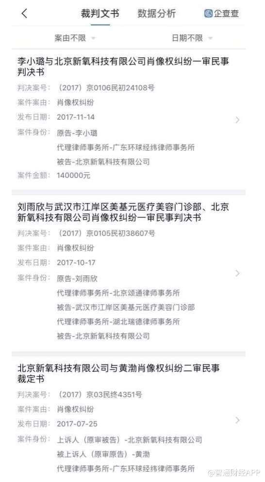 起诉过新氧的明星不止李小璐,还有鹿晗、林志玲、张丰毅等等,在这个问题上,新氧是“光脚的不怕穿鞋的”,不管你整没整,我都说你整了。只要你不怕顶风撒尿一身骚,你大可以来找我,赔你的钱相比碰瓷你赚的来说完全不算回事。