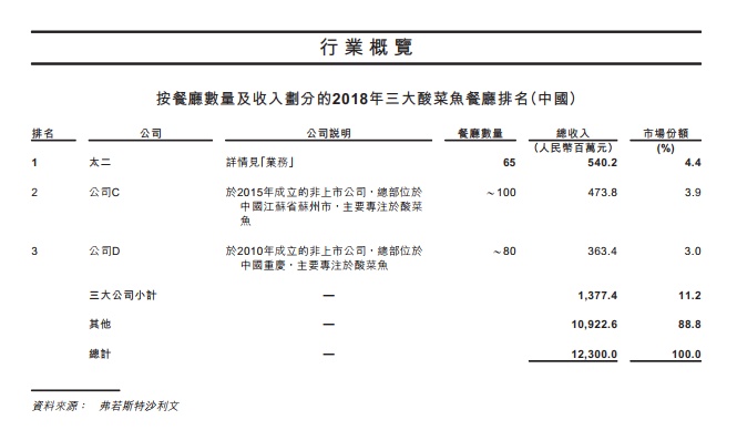 按中国酸菜鱼餐厅总收入计,中国酸菜鱼市场由2014年的人民币40亿元大幅增长至2018年的人民币123亿元,复合年增长率为32.3%。2018年,太二实现收入人民币540.2百万元,在中国所有酸菜鱼餐厅中排名第一,市场份额为4.4%。