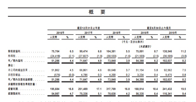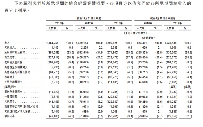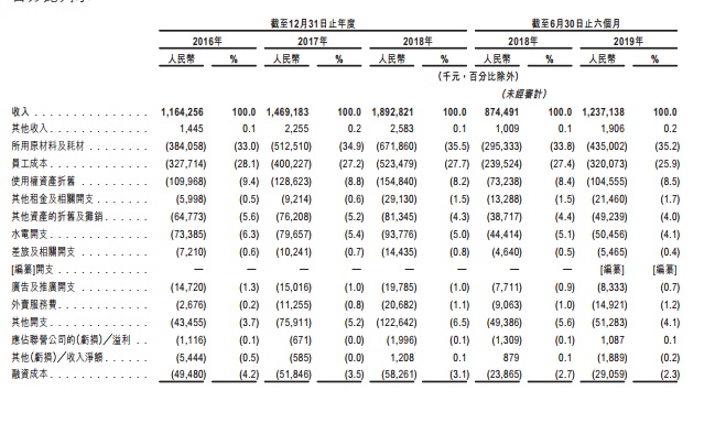 公司收入增长迅速。于2016年、2017年及2018年,总收入分别为人民币1,164.3百万元、人民币1,469.2百万元及人民币1,892.8百万元,复合年增长率为 27.5%。收入由截至2018年6月30日止六个月的人民币874.5百万元增加41.5%达到截至2019年6月30日止六个月的人民币1,237.1百万元。