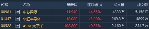 受消息影响,中芯国际涨4.9%,报11.98港元,成交额5.15亿港元。而华虹半导体(01347)则涨3.08%,报18.06港元,成交额4864.78万港元。
