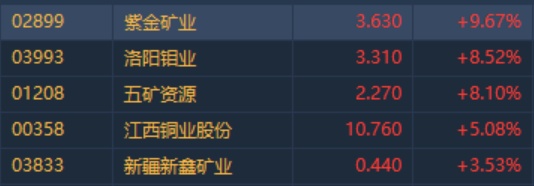 智通财经APP获悉,有色金属板块全线大涨,紫金矿业(02899)大涨近10%,暂领涨板块。截至14时44分,紫金矿业涨9.67%,报价3.63港元,洛阳钼业(03993)涨8.52%,五矿资源(01208)涨8.1%,江西铜业股份(00358)涨5.08%。