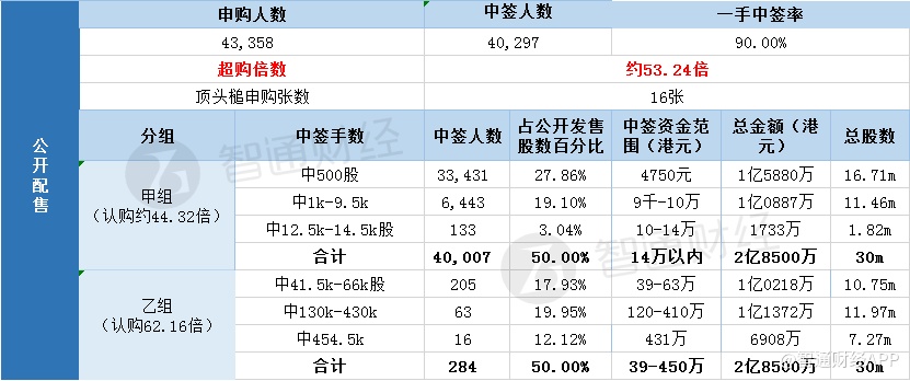 其中,公开配售申购人数43358,一手中签率90%,超购倍数约53.24倍。