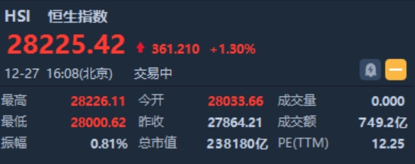 智通财经APP获悉,恒指早盘高开169.45点获0.61%,报28033.66点。截至收盘,恒生指数涨361.21点或1.3%,报28225.42点,全日成交额达749.26亿。国企指数涨1.44%,报11194.55点,红筹指数涨1.53%,报4512.28点。
