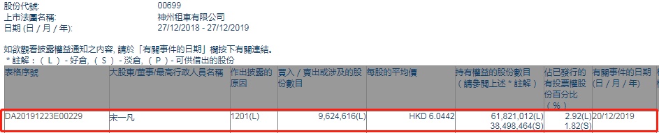 智通财经APP获悉,联交所最新资料显示,12月20日,执董宋一凡减持神州租车(00699)962.4616万股,每股作价6.0442港元,总金额约为5817.31万港元。减持后最新持股数目约为6182.10万股,最新持股比例为2.92%。