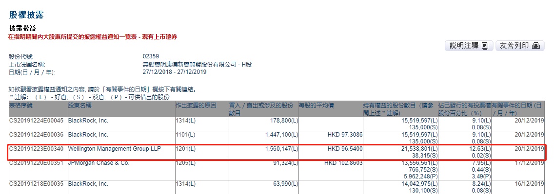 智通财经APP获悉,联交所最新资料显示,12月20日,Wellington Management Group LLP减持药明康德(02359)156.01万股,每股作价96.54港元,涉及总金额约为1.51亿港元。减持后最新持股数目约为2154万股,最新持股比例为12.63%。