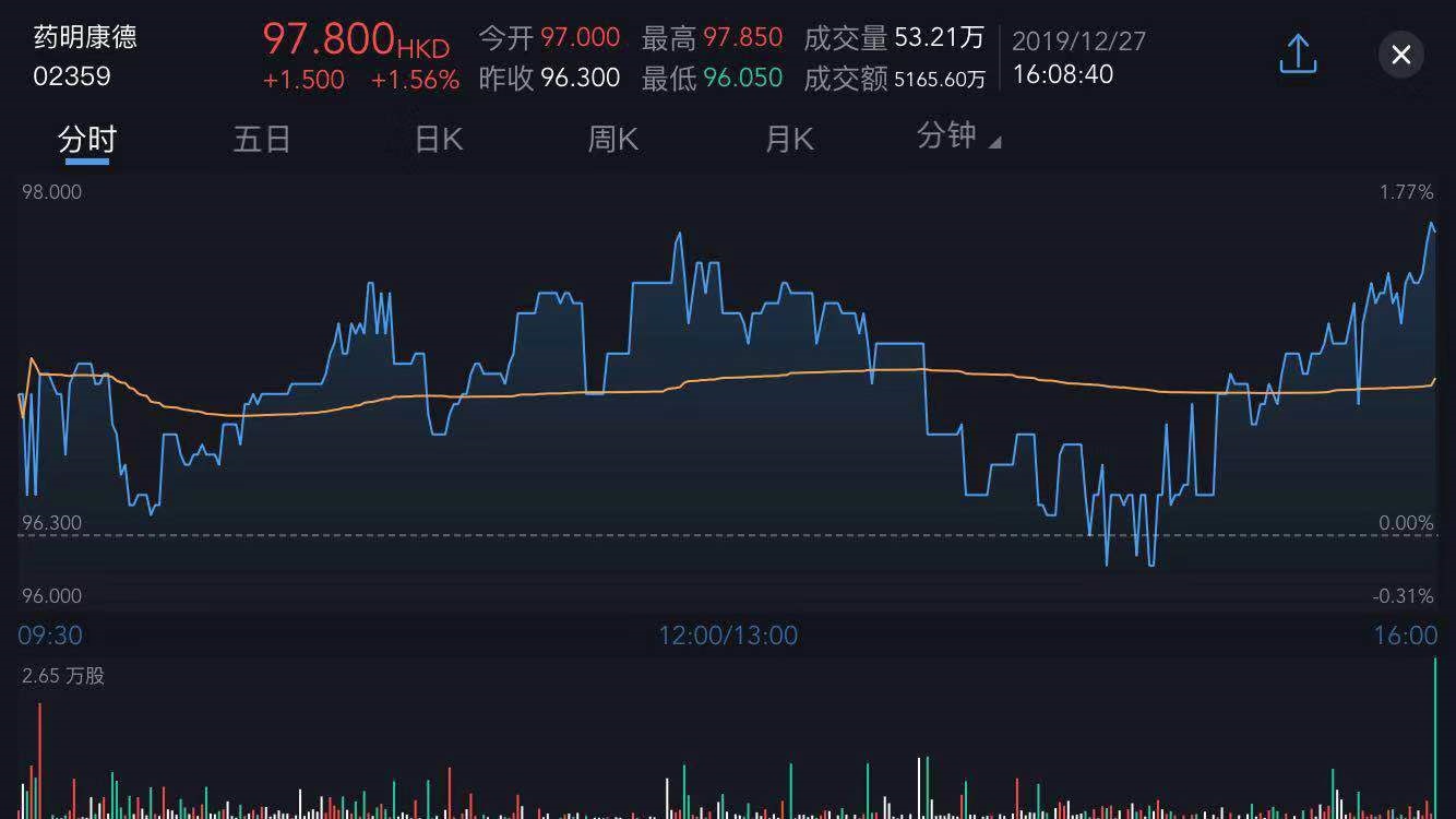 截至今日收盘,药明康德(02359)涨1.56%,报97.8港元。