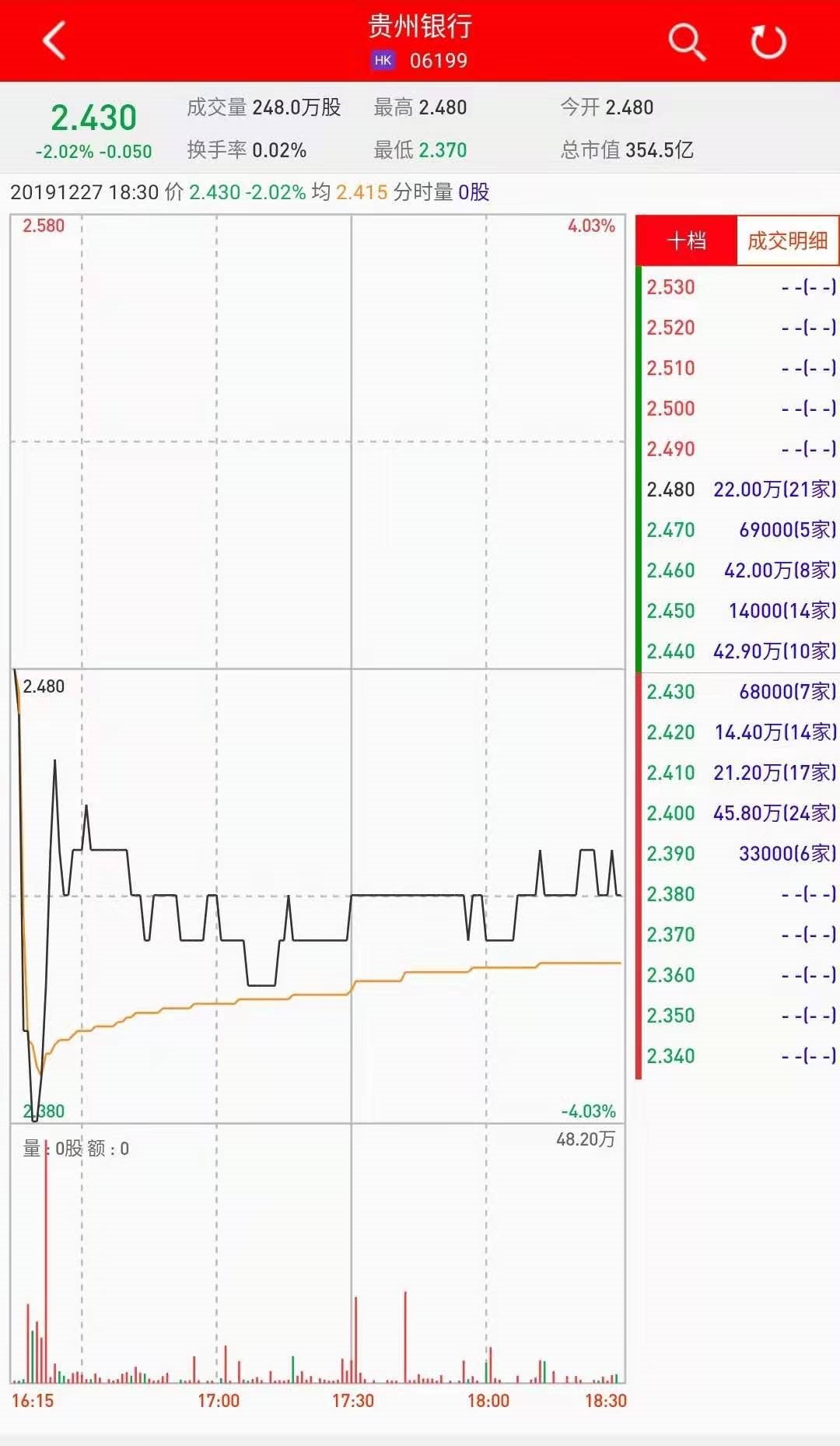 智通财经APP获悉,贵州银行(06199)将于下周一(12月30日)挂牌。截至今日收盘,利弗莫尔证券暗盘交易显示其报价2.43港元,较招股价2.48港元跌2.02%。每手1000股,不计手续费,每手亏50港元。